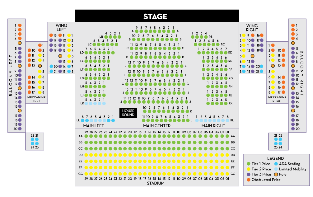 All Mainstage Series events take place in the Ruth A. Knoll Theater and have three tiers of seating. Premier — Left and right wings. Tier 1 — Main floor & the lower 4 rows of the Stadium. Tier 2 — the last three rows of the Stadium, first row Mezzanine, and Balcony. Some seats are marked obstructed view and are the lowest price. Note also seats marked as limited mobility. If someone in your party needs wheelchair or limited mobility seating, it is best to call the box office so staff can help identify the most accommodating seats for your group.