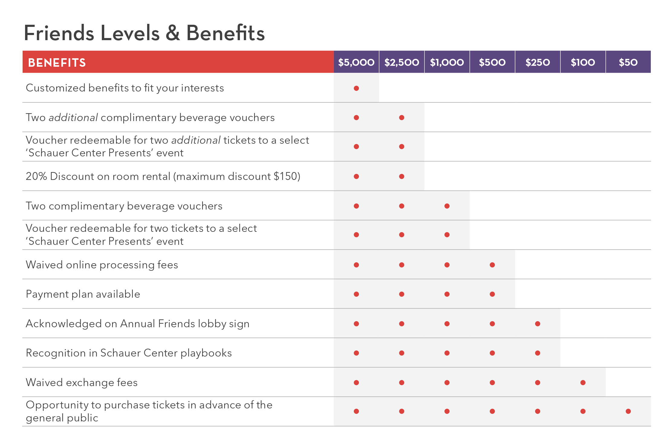 The Friends of the Schauer Center are a community of supporters who have a passion for the performing arts and are dedicated to helping us develop, support, and promote the arts in our community.